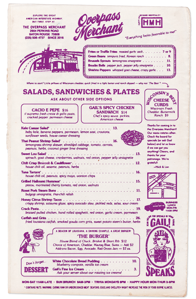 2904 Perkins RoadBaton Rouge, LA 70808(225) 508-4737 DIRECTIONS O—P—E—NMONDAY – SATURDAY11am – LateSUNDAY BRUNCH9am – 3pmBUSINESS LUNCHMonday – Friday 11a - 3p